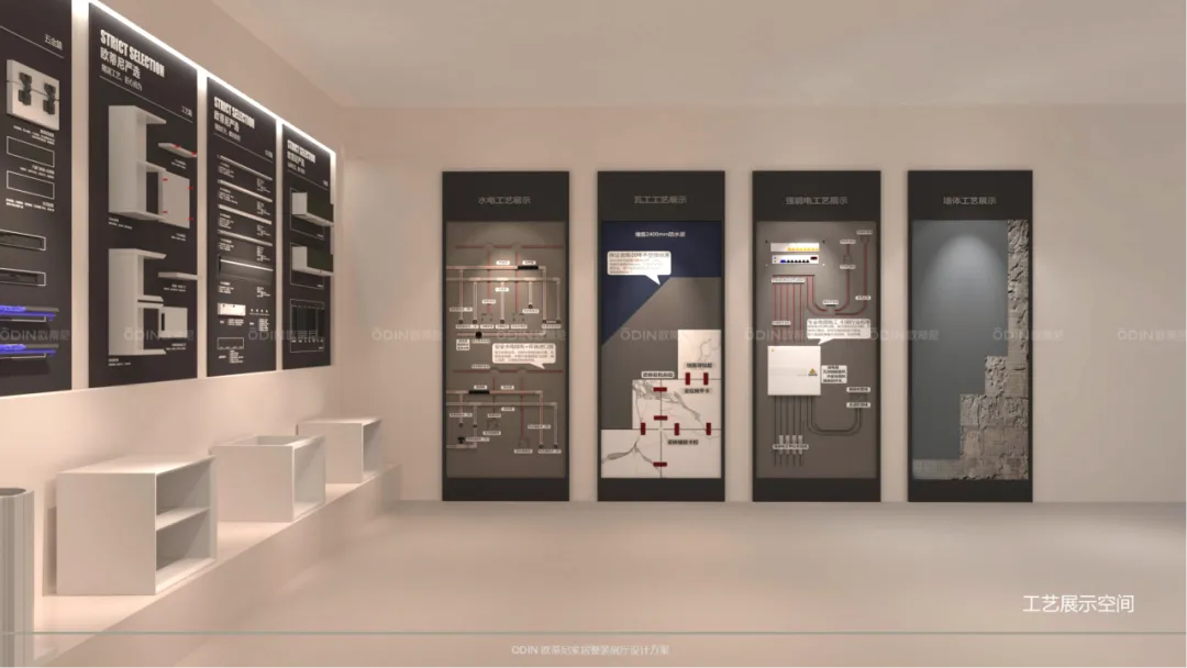 作為展廳的核心區(qū)域,公共體驗(yàn)區(qū)集成了設(shè)計(jì)辦公、工法道具展示、硬裝工藝展示及VIP洽談區(qū)等多個(gè)功能區(qū),為客戶提供了全方位、一站式的服務(wù)體驗(yàn)。