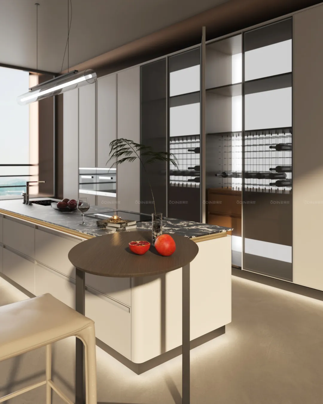 此外,金屬紅酒架的引入,不僅防水防潮、易于清潔,其模塊化設計更如搭積木般簡便安裝,極大地提升了品酒體驗。而發光背板的設計,則在提供輔助照明的同時,營造出一種溫馨而獨特的氛圍,使廚房成為家中一道亮麗的風景線。