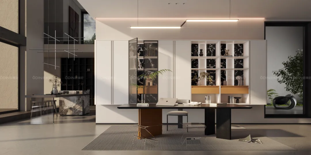書房空間采用了懸浮設計,賦予整組柜體以靈動優雅的姿態。柜體巧妙融入奢石紋樣背板,不僅提升了空間的高級感,還洋溢著濃郁的藝術氣息。