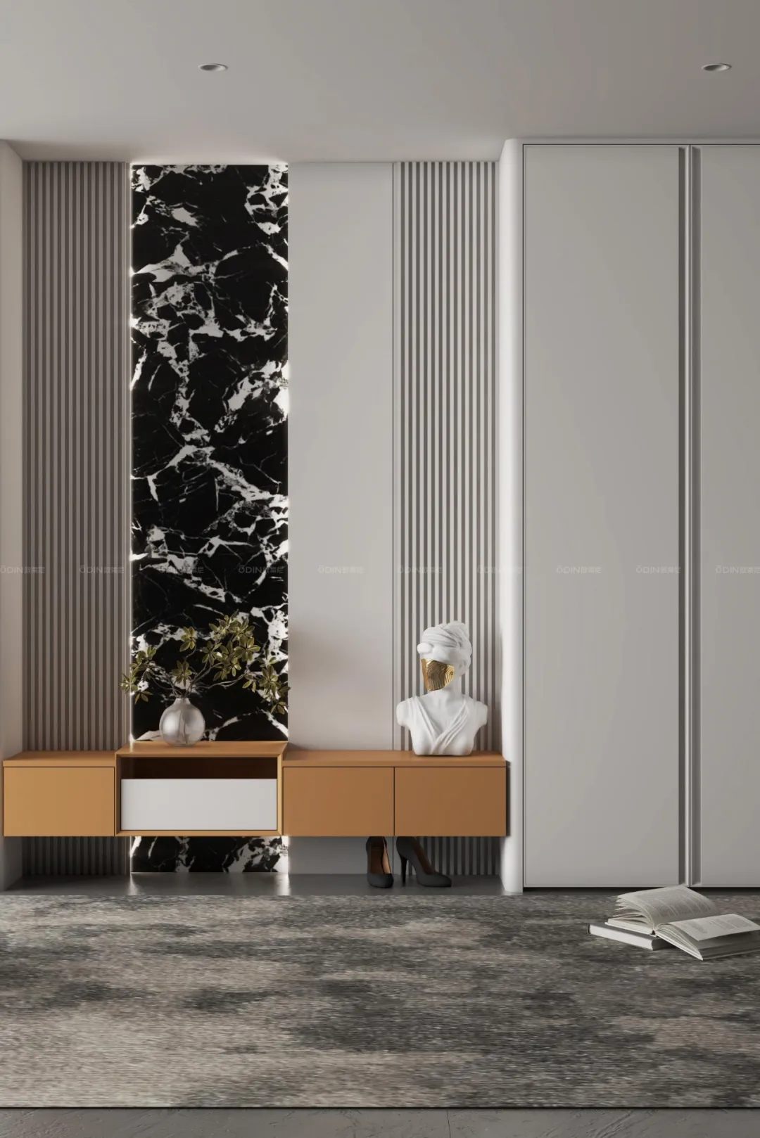 入戶空間被精心設計得既視覺輕盈又層次豐富,其下方采用懸空設計,巧妙地讓底部留空,營造出一種不呆板的靈動美感。背墻則巧妙融入了深邃的黑色奢石紋樣和格柵設計,其獨特的紋理不僅為空間增添了一抹神秘與深邃,更彰顯出非凡的品質與奢華感,讓人一進門便能感受到與眾不同的高端氛圍。