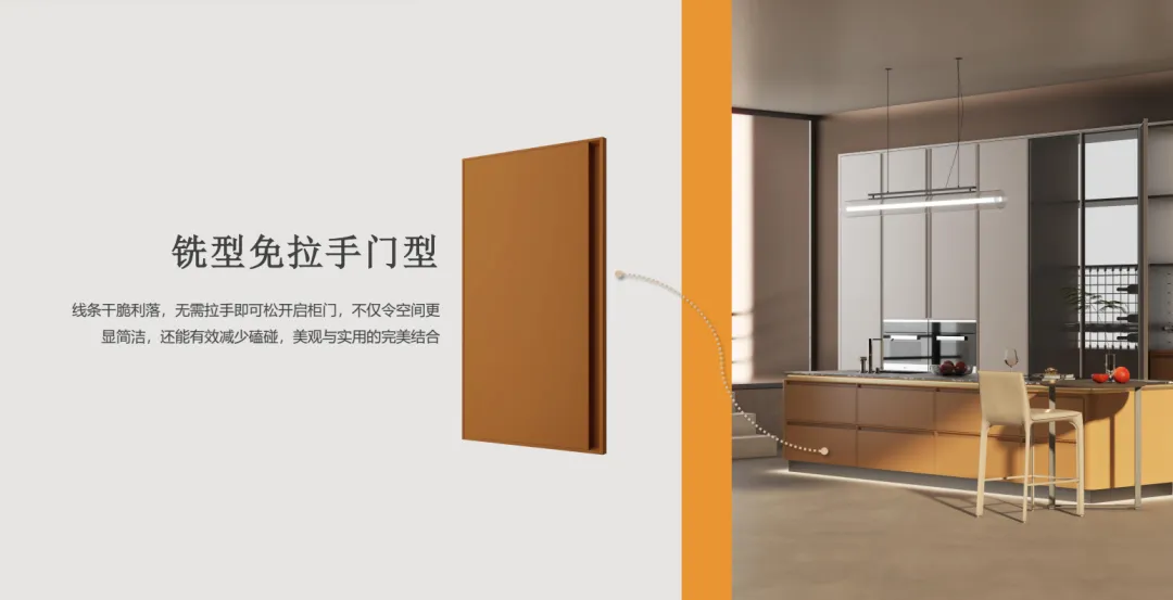線條干脆利落,無需拉手即可輕松開啟柜門,不僅讓空間更顯簡潔,還能有效減少磕碰,真正實現美觀與實用的雙重價值。