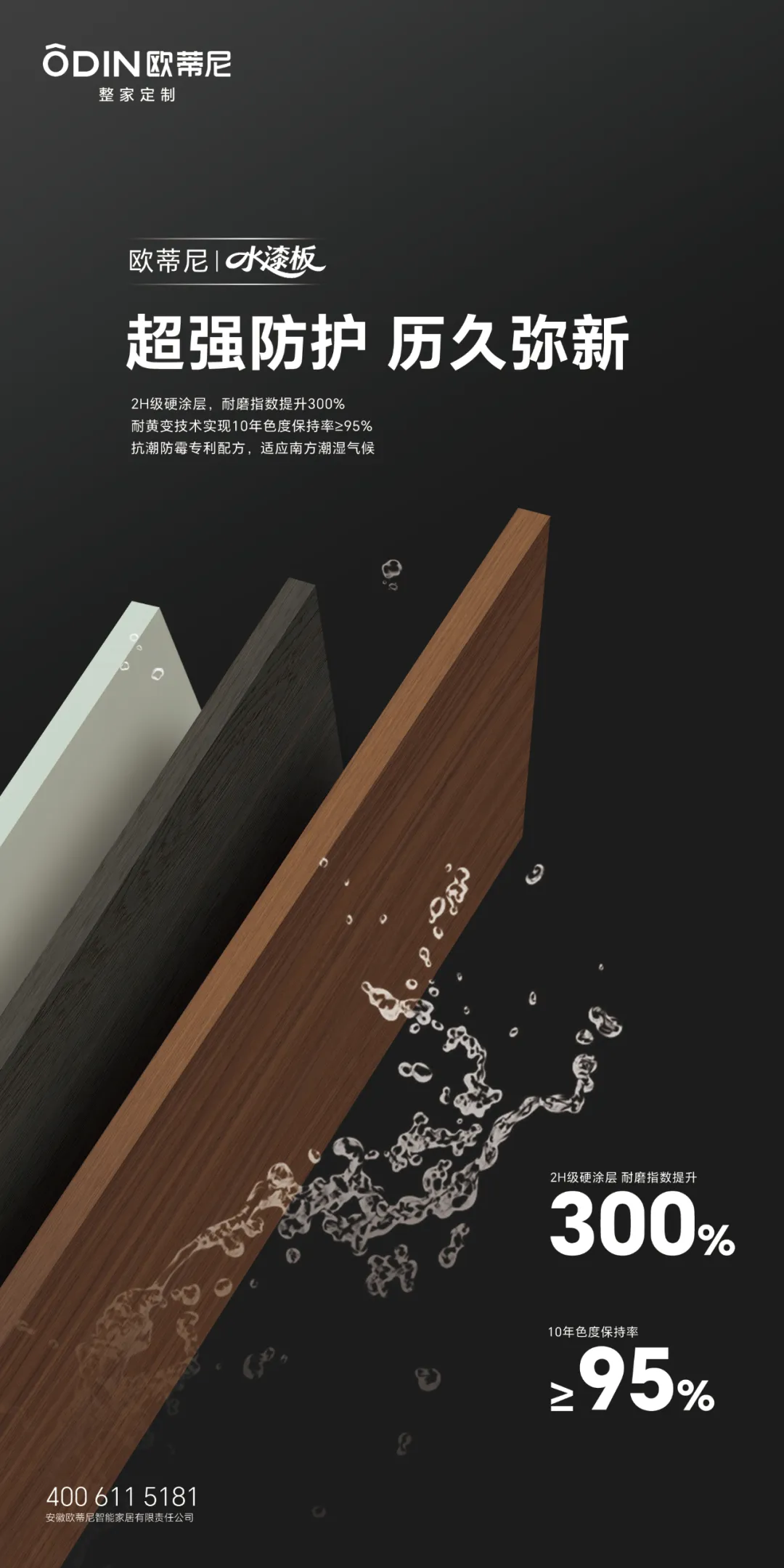 在南方回南天的潮濕里,在北方地暖的炙烤下,歐蒂尼用硬核科技對抗歲月侵蝕,2H級硬涂層讓家具表面堅如磐石,耐磨指數飆升300%;獨創耐黃變技術鎖定色彩,十年后色度保持率仍≥95%;抗潮防霉專利配方則像給木材穿上“隱形雨衣”,讓霉斑無處遁形。想象一下:水滴在漆面如露珠般滑落,十年色卡對比僅現細微漸變——這便是科技賦予的“凍齡魔法”。