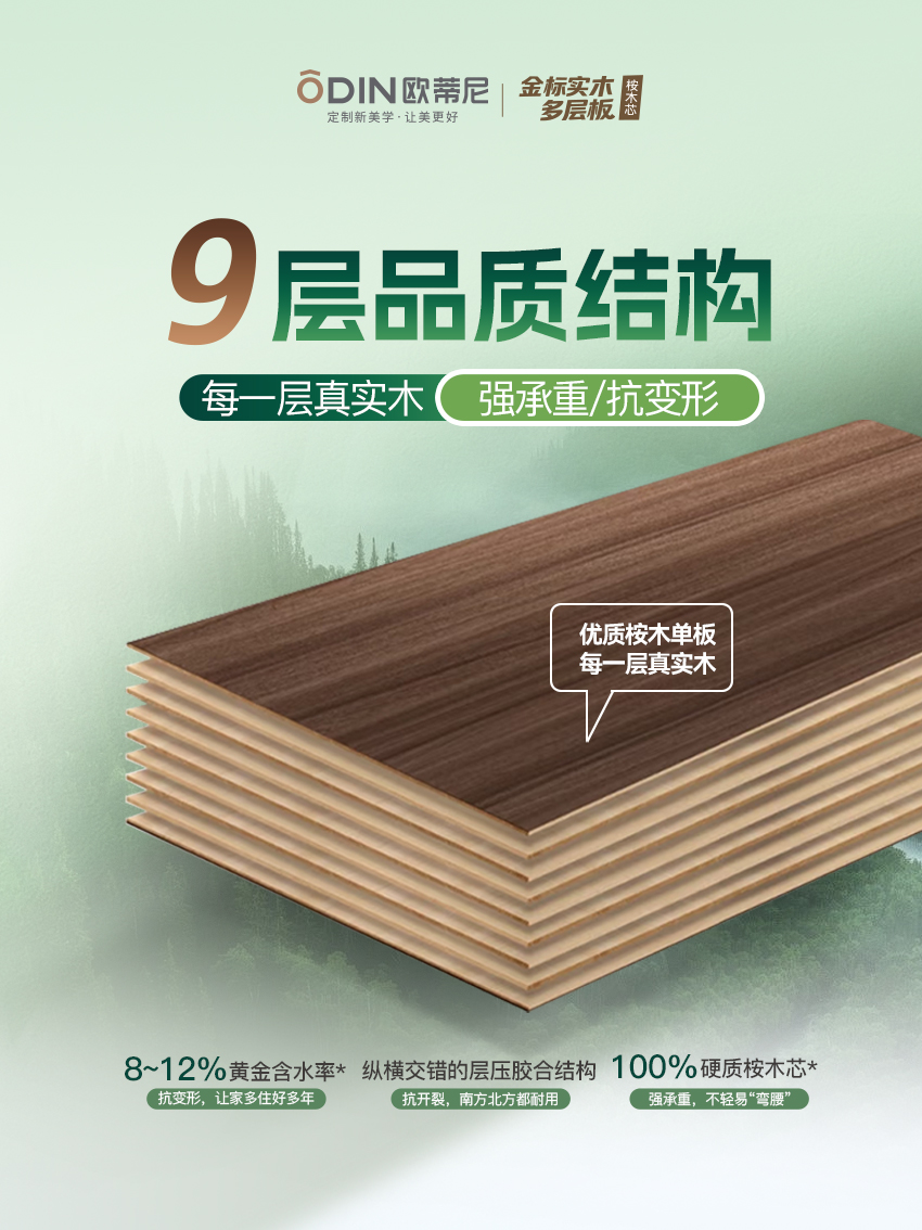 ODIN歐蒂尼金標實木多層板,以卓越品質重新定義行業標準。精選10年以上優質桉木,采用9層縱橫交錯層壓膠合工藝,打造兼具強度與美學的新一代環保板材,為高端定制家居提供完美解決方案。
