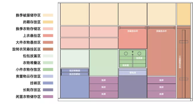 這類的整理區通常布置在最頂部,多用來放置換季的棉被等大件物品。若平時要放置的被褥較多,那么被褥區就要多設計一些。