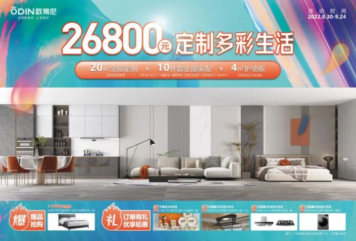 狂歡十一,好禮惠不停,一年僅此一次。歐蒂尼全國門店于8月30日—9月24日推出以“ 26800定制多彩生活”為主題的全國大型聯動感恩回饋活動。此次鉅惠內容主要包括20平米全屋定制,4平米護墻板和10件套全屋家配,僅需26800元,超值特供,終極放價,將優(yōu)惠進行到底!