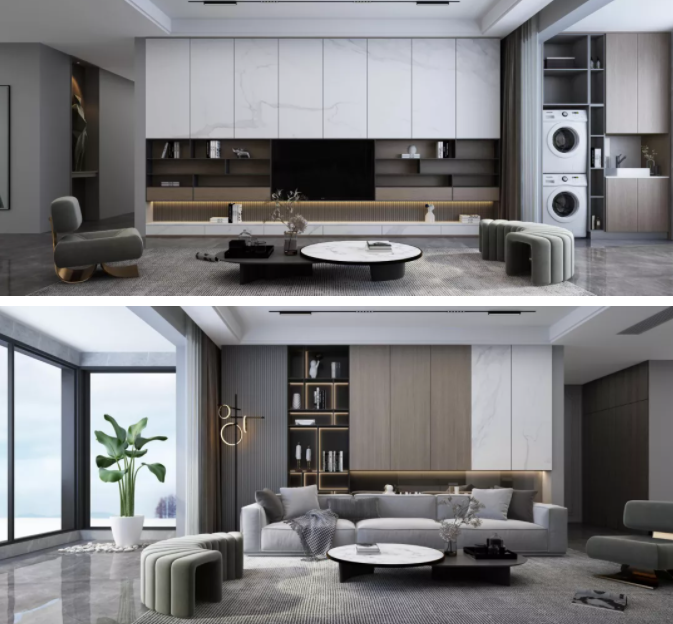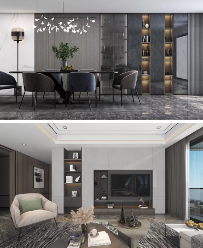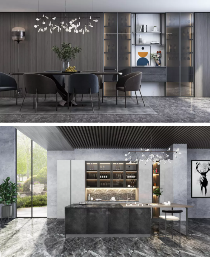 生活需要層次,此款新品主要以深淺三色搭配并創新采用多層次間架設計,豐富視覺更能給生活帶來更多樂趣。門板采用的是莫蘭迪色系門板,使用超柔膚感材質,整體以高級灰色為主色調,讓整個家居空間在低調奢華之中透露出舒適自然。多材料結合 鋁框玻門、木紋、石紋、等多材料混搭,整體質感多樣但又和諧自然地融合在一起,提升產品的優雅氣質。