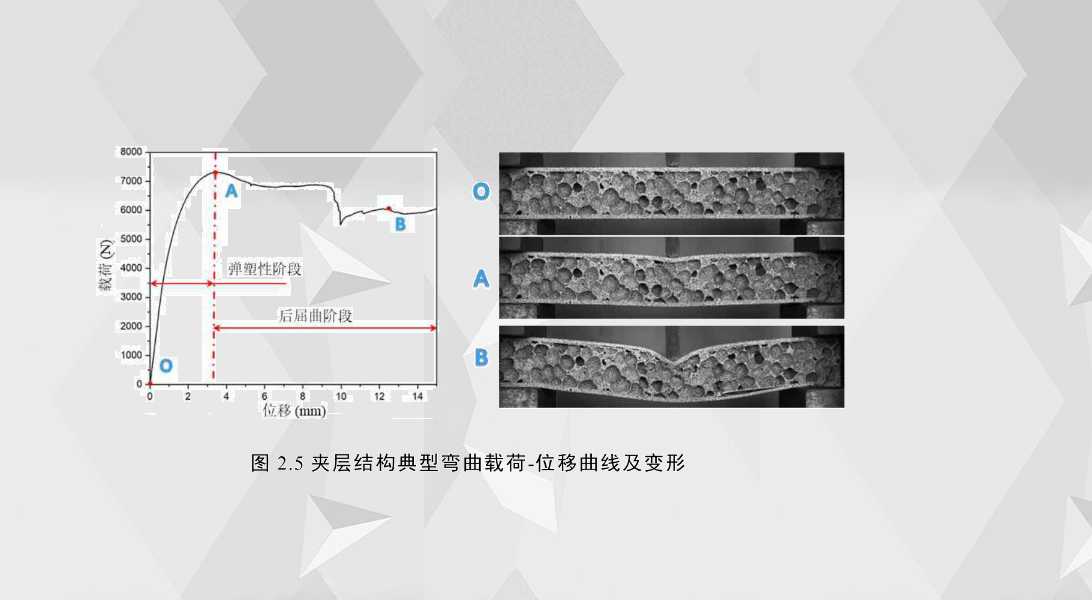 2.3失效模式和結構響應圖2.5是泡沫鋁夾層結構彎曲試驗典型的載荷-位移曲線和試件在三個特定位置的變形、破壞圖。根據載荷-位移曲線的初始拐點和變形、破壞程度,可將載荷-位移曲線分為兩個階段,兩個階段的臨界點位移對應的載荷稱為臨界失效模式的臨界載荷。第一階段為彈塑性階段,從O到A,此階段夾層結構主要發生彈性變形,載荷與位移呈近似線性增長關系;第二階段為初始拐點至最終破壞,稱為后屈曲階段,此階段夾層結構的局部或者整體發生明顯變形、破壞。