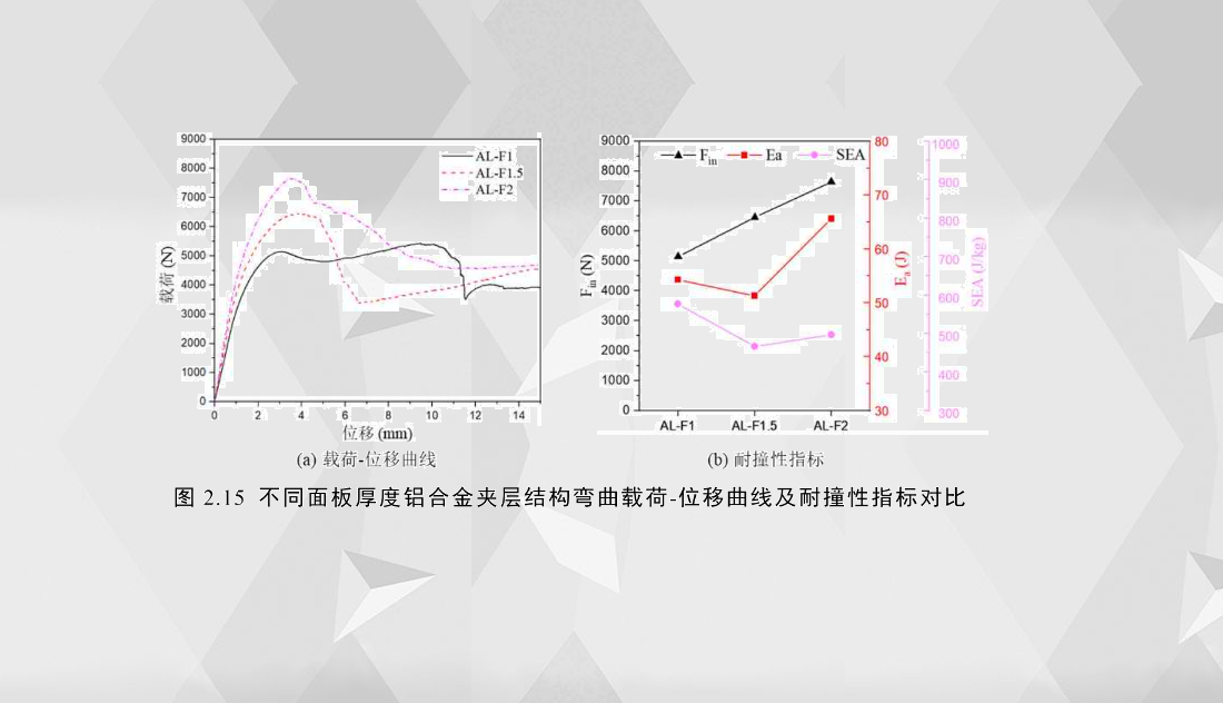 圖2.15(a)比較了不同面板厚度的鋁合金夾層結(jié)構(gòu)載荷-位移曲線。AL-F的載荷-位移曲線為具有兩個(gè)峰值載荷的曲線類型Ⅱ,臨界失效模式為壓痕(IN),其第二個(gè)峰值力下降的原因是試樣位移達(dá)到10m左右時(shí),夾層結(jié)構(gòu)的一側(cè)發(fā)生下界面失效并隨后附帶泡沫芯層的剪切裂紋,導(dǎo)致載荷顯著下降,從而嚴(yán)重降低了結(jié)構(gòu)的能量吸收能力。與AL-F1不同的是,AL-F1.5和AL-F2的臨界失效模式為芯層剪切(CS),兩者的載荷-位移曲線屬于曲線類型Ⅱ,載荷在達(dá)到臨界載荷后先下降,然后保持相對穩(wěn)定。AL-F1.5和AL-F2的區(qū)別在于,前者在臨界載荷之后的5.3mm左右發(fā)生界面失效,使其載荷下降的速度比AL-F2快,而后者的后屈曲變形模式只是芯層剪切(CS)的演變。從臨界失效模式后的載荷變化趨勢來看,芯層剪切(CS)之后的載荷-位移曲線的變化趨勢明顯大于壓痕壓入(IN)的變化。
