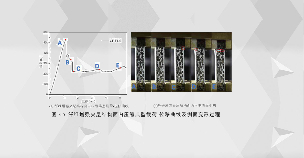 對(duì)于面板為纖維增強(qiáng)復(fù)合材料(碳纖維和玻璃纖維)的夾層結(jié)構(gòu)而言,其載荷-位移曲線和變形/失效與鋁合金夾層結(jié)構(gòu)的有很大的差異。以面板厚度約1.5mm 的碳纖維夾層結(jié)構(gòu)為例,其載荷-位移曲線大致可以分成兩個(gè)階段,如圖3.5(a)所示,第一階段為彈性階段O-A,與鋁合金夾層結(jié)構(gòu)的曲線第一階段相似,載荷隨位移的增加而基本呈線性增長;第二階段為A點(diǎn)之后,隨著壓潰位移的增加,碳纖維面板發(fā)生脆性斷裂,導(dǎo)致載荷發(fā)生斷崖式下降,由于加載位移較小,芯層泡沫未發(fā)生嚴(yán)重的破壞,使得纖維增強(qiáng)夾層結(jié)構(gòu)仍具有一定的承載能力。