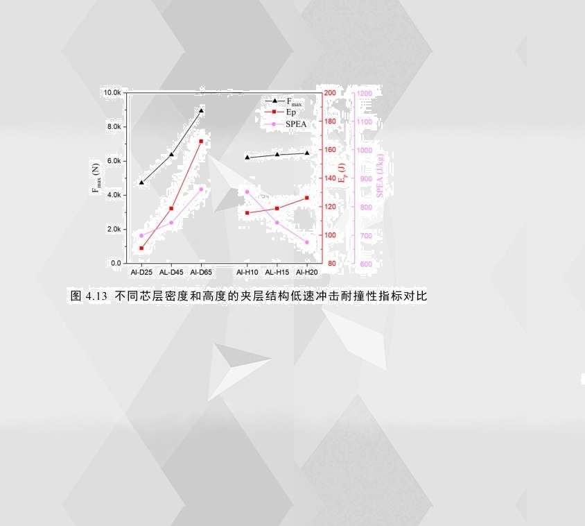 根據(jù)各配置的試件在穿透能沖擊下的載荷-位移曲線,計(jì)算得出各耐撞性指標(biāo)比較如圖4.13所示,可以看出,隨著夾層結(jié)構(gòu)芯層密度的上升,其耐撞性能明顯提高,芯層密度從0.25g/cm3增加到0.65g/cm3,夾層結(jié)構(gòu)的初始峰值載荷增加89%,穿透吸能提高82%,比穿透能提高23%;對(duì)芯層高度而言,試件的芯層高度從10mm增加到20mm,其初始峰值載荷和穿透吸能均只有小幅增加,特別是初始峰值載荷,增加的幅度基本忽略不計(jì),而其比穿透能反而明顯降低,大約下降了25%。